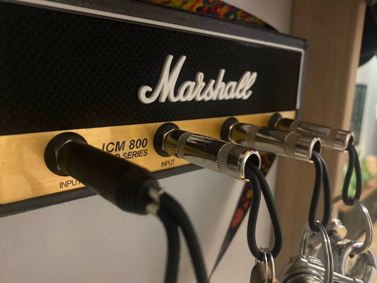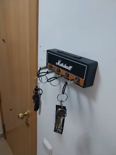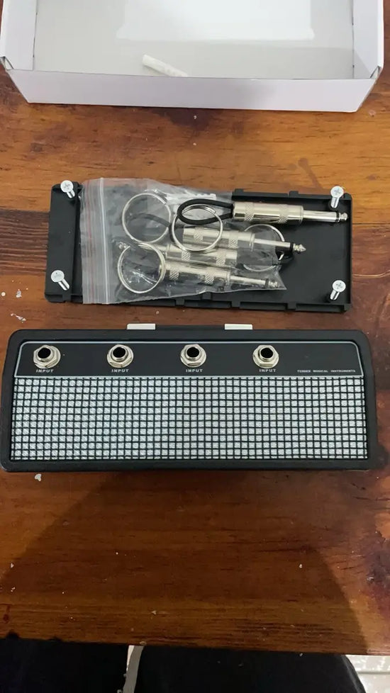 Nei, denne nøkkelholderen gir ingen musikalsk lyd. Designet er inspirert av jack-kontaktene til forsterkere for en original visuell effekt, men den produserer ikke musikk eller lyd.